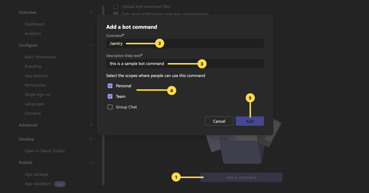 ). Give your command a description, select "Personal" and "Team" as the scopes, then click "Add".