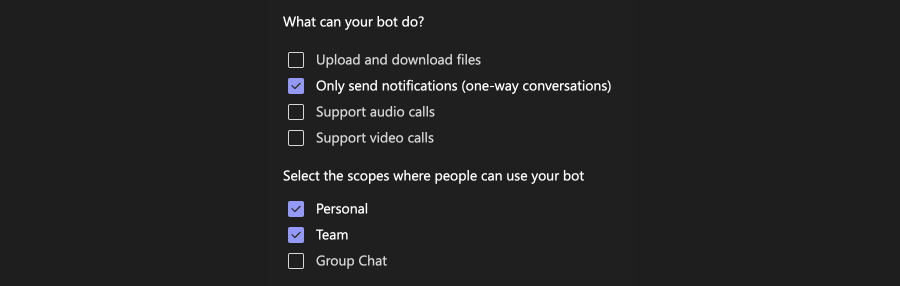 - Enable your bot to "Only send notifications (one-way conversations)" and select "Personal" and "Team" as the scopes.